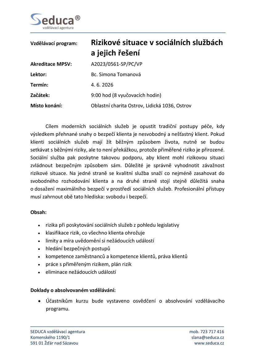 - Rizikové situace v sociálních službách a jejich řešení, který se bude konat 4. června 2026.