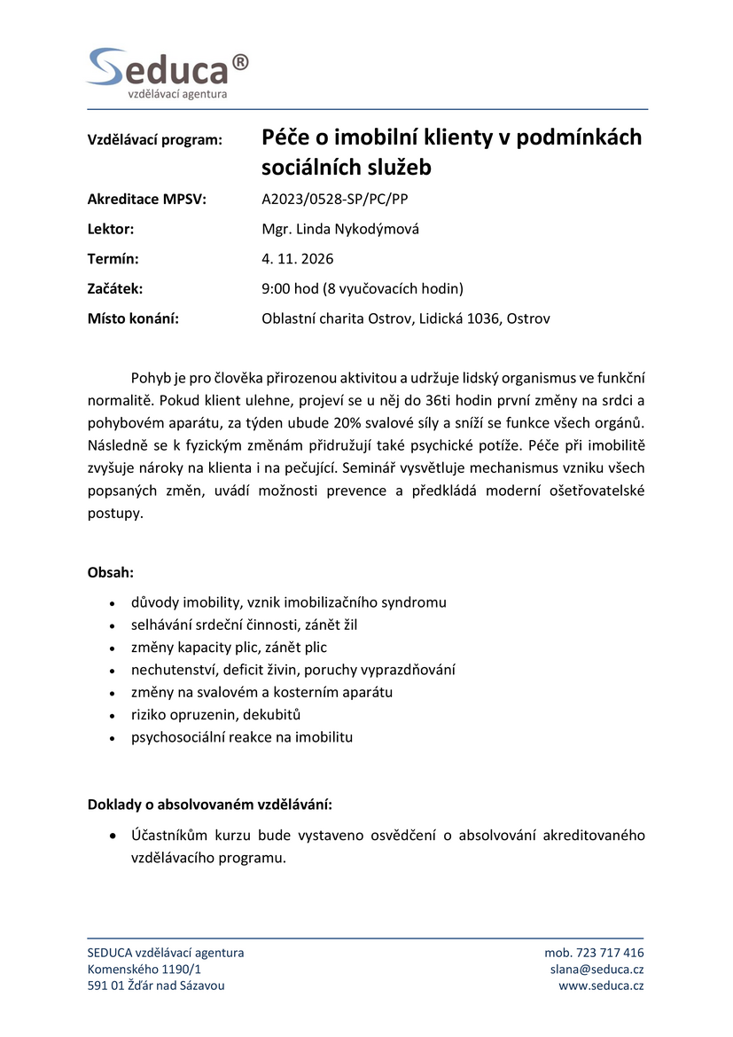 - Péče o imobilní klienty v podmínkách sociálních služeb, který se bude konat 4. listopadu 2026.