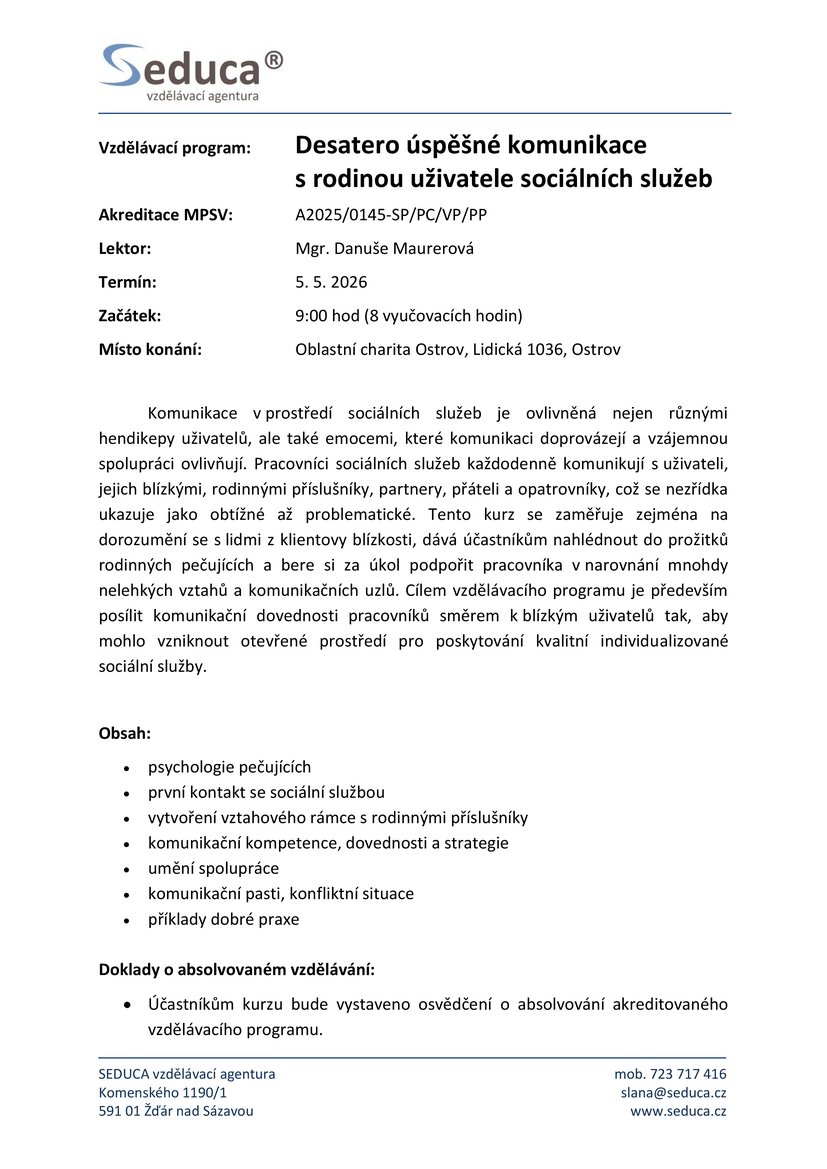 - Desatero úspěšné komunikace s rodinou uživatele sociálních služeb, který se bude konat 5. května 2026.