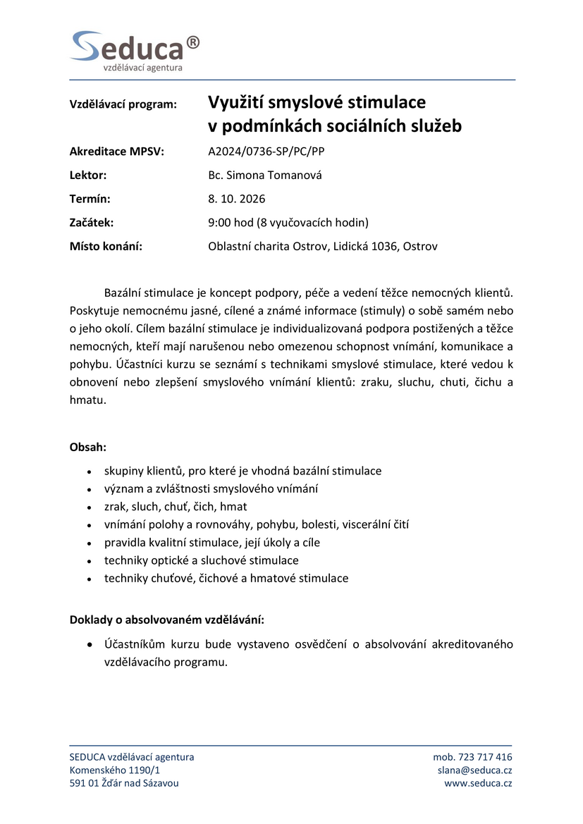 - Využití smyslové stimulace v podmínkách sociálních služeb, který se bude konat 8 října 2026.