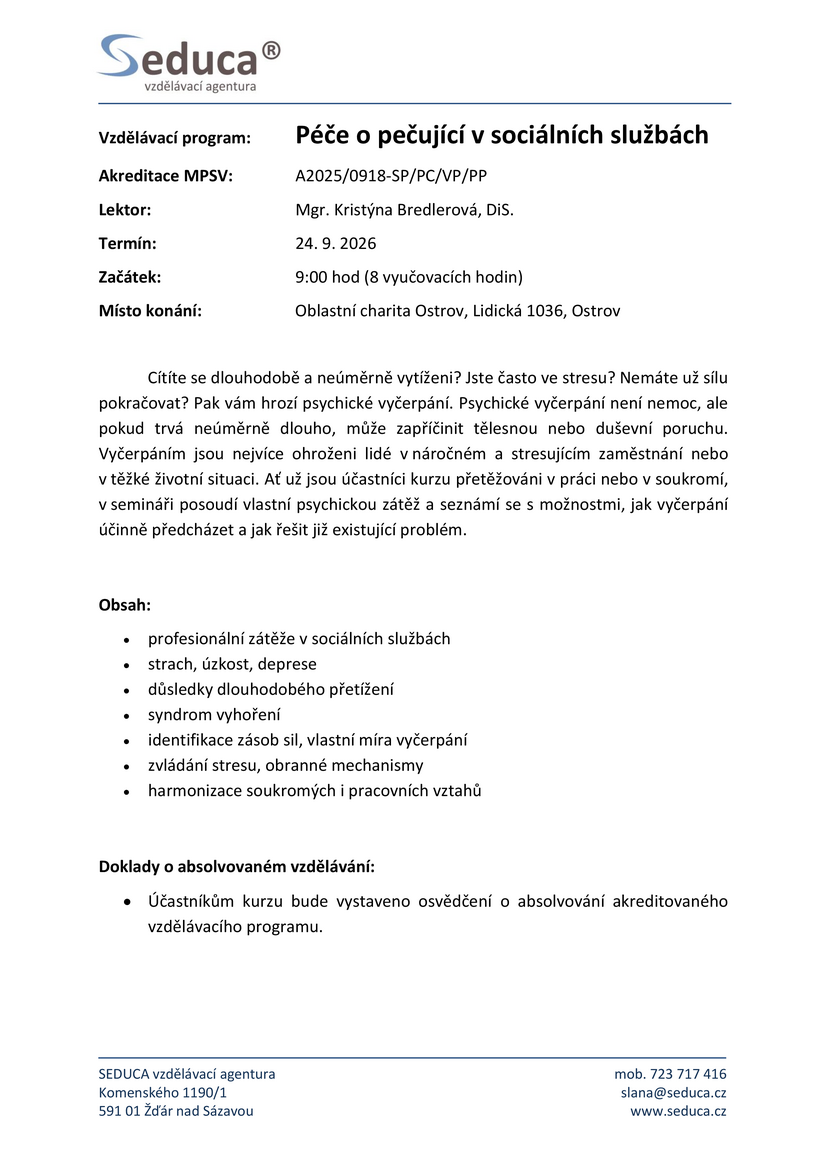 - Péče o pečující v sociálních službách, který se bude konat 24. září 2026.